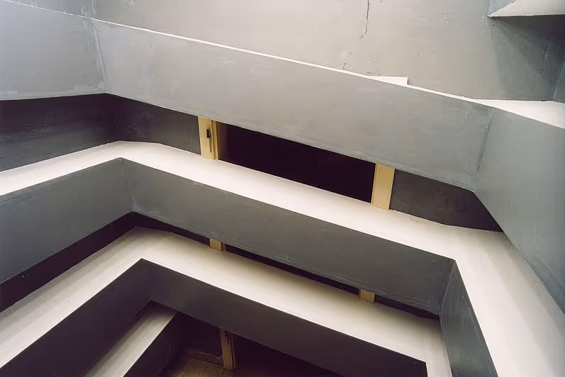 Vertikale Flächen (Front des Volumens und Wandflächen): grauer Betonlack Horizontale Flächen: weiße Wandfarbe Beleuchtung: fünf parallele Leuchtstoffröhren an der Decke Bittweg Düsseldorf