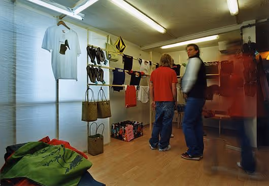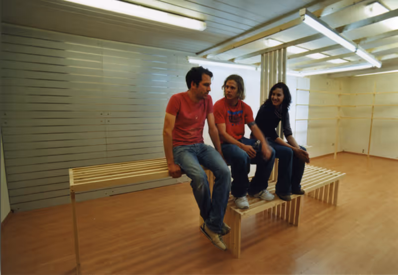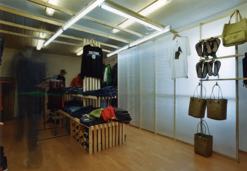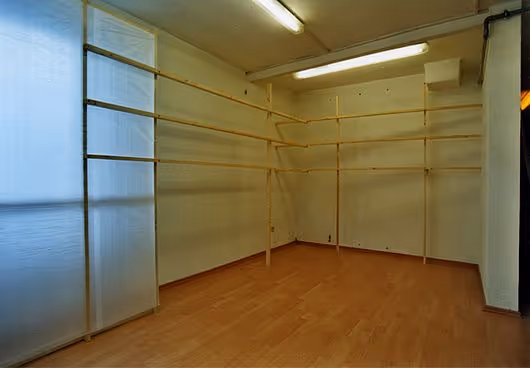Dachlatten, weiße Abdeckplane und NeonröhrenGemeinschaftsarbeit mit Seb KoberstädtFirst Try, Skateshop Heidenheim