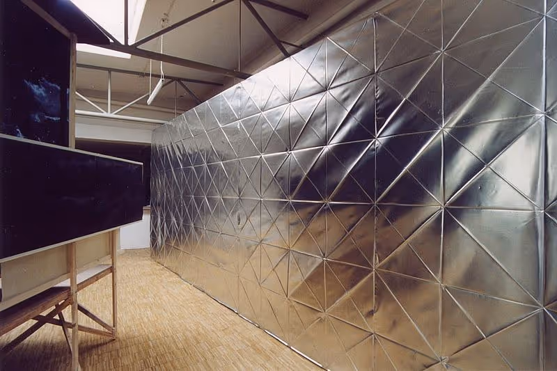 Geknickte und mit Chromspray lackierte PE Folie an Holzleiste befestigt und schräg zum Raum frei gehängt