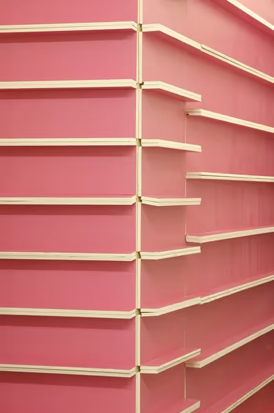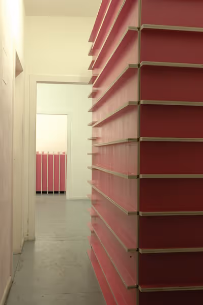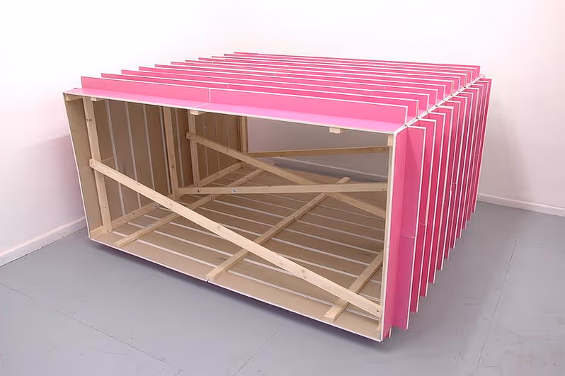 Drei Boxen aus lackiertem und geknicktem RigipsLack, Rigips, Holz ca. 200cm x 220cm x 50cm240cm x 120cm x 200cm190cm x 110cm x 200cmKonsortium, Düsseldorf