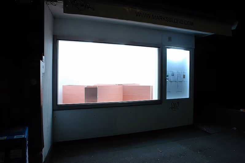 Mit Kupferchromspray lackierte Rigipsplatten, in Streifen geschnitten, geknickt und vor Ort zu einem Volumen gestapelt116cm x 220cm x 340cmthe exchange LADEN (D) im Marks Blond Projekt R.f.z.K (CH)