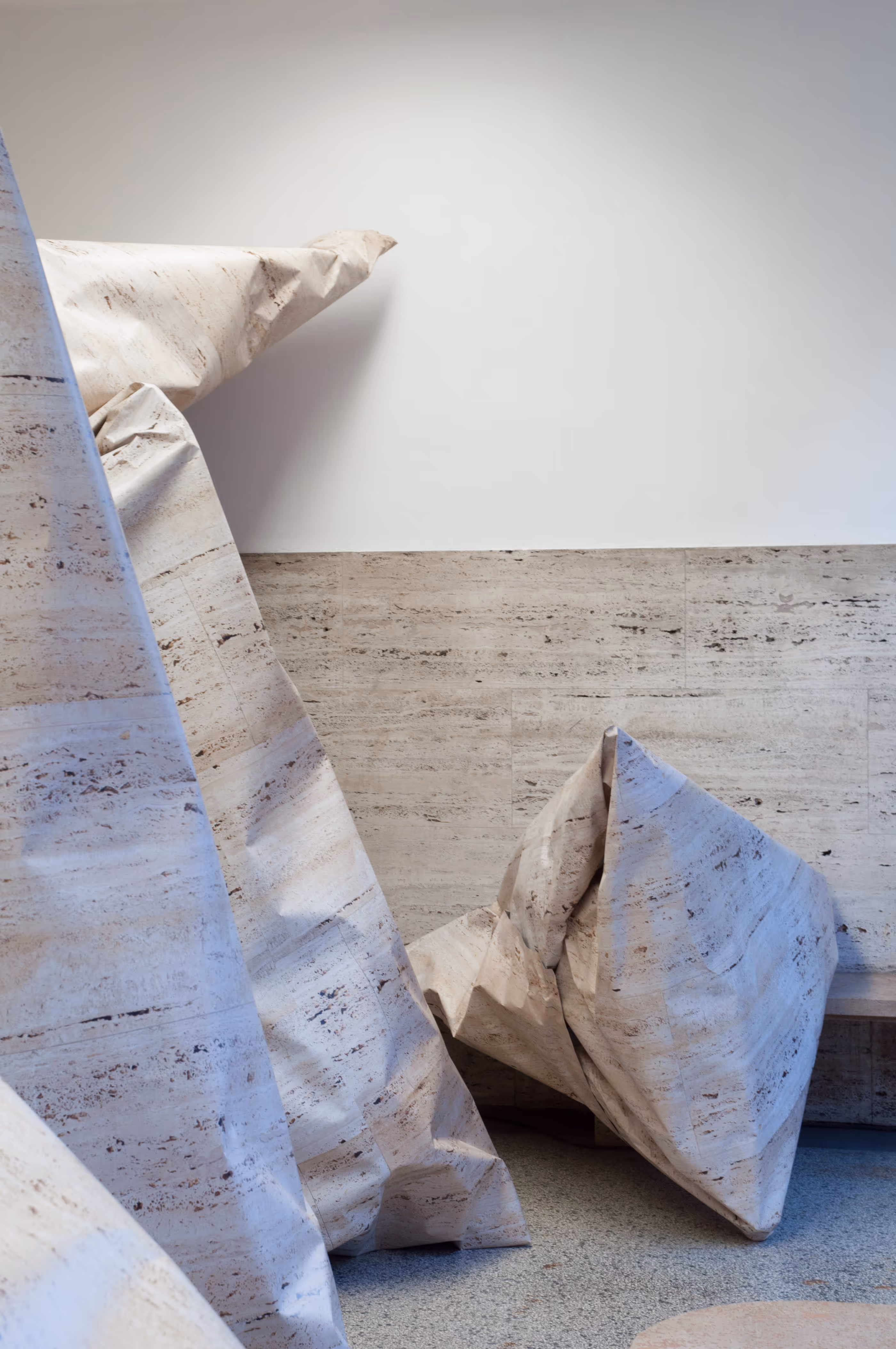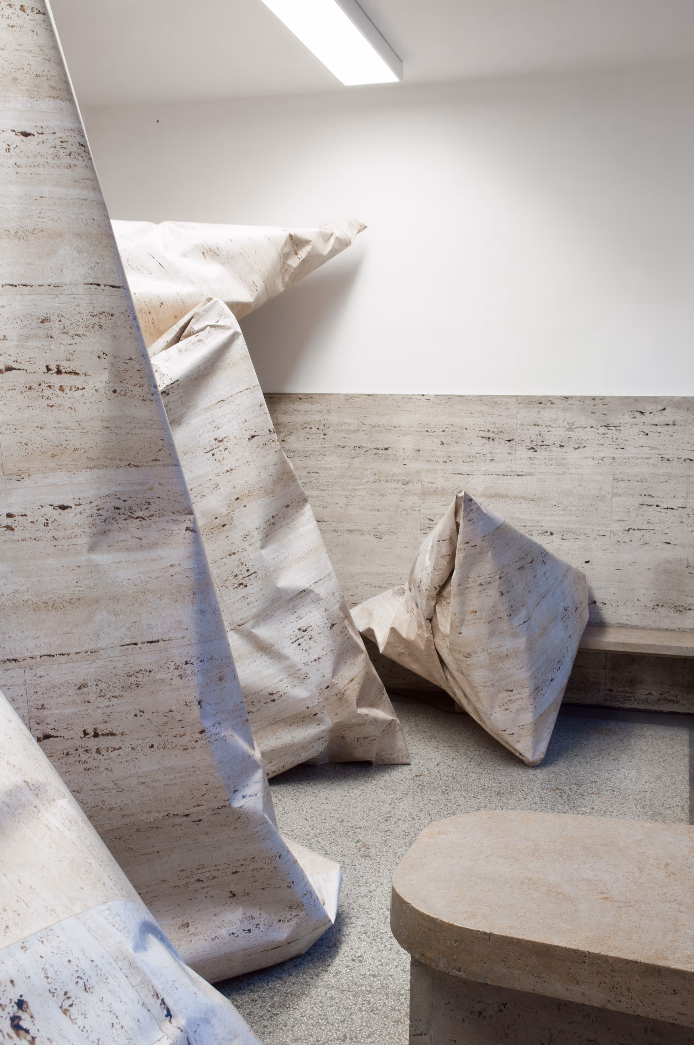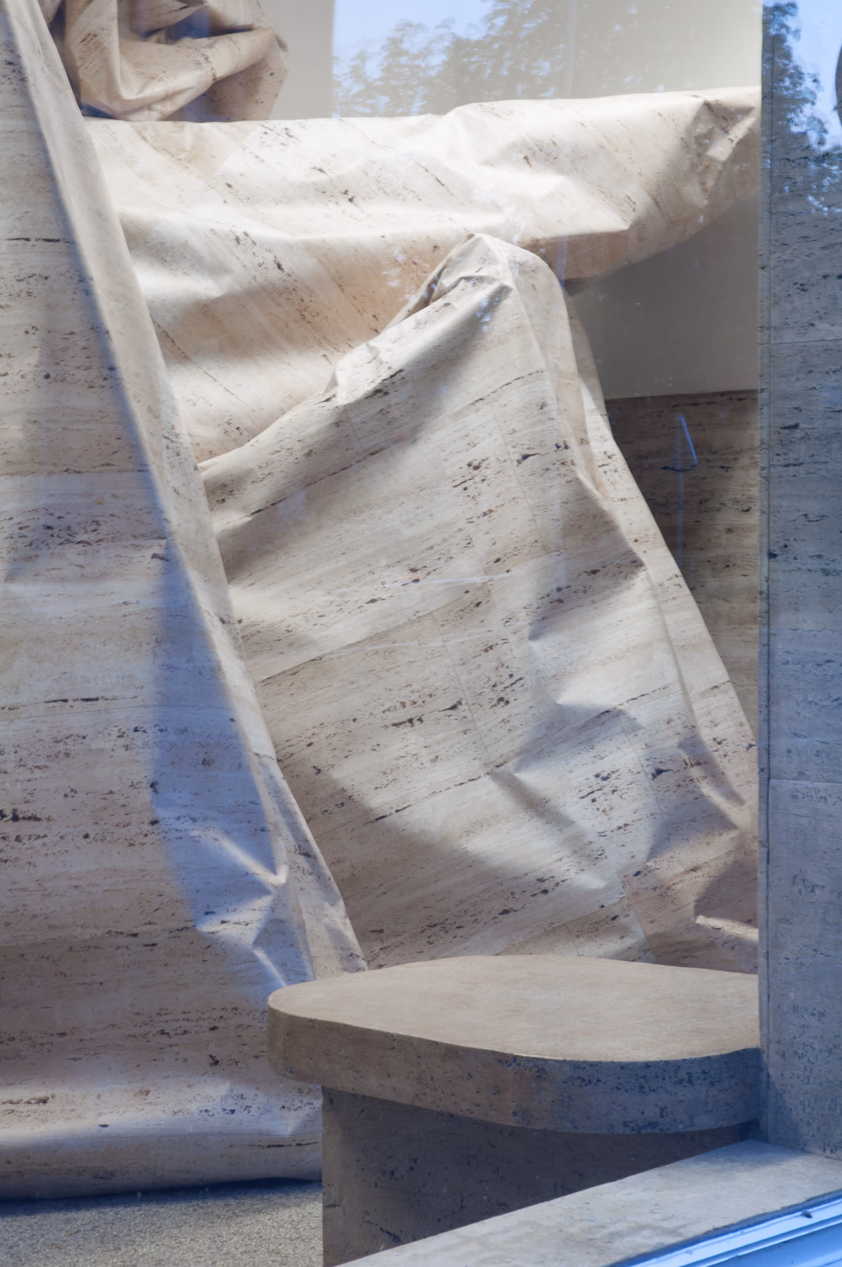 Die im Ausstellungsraum vorhandene Wandvertäfelung aus Travertin dient als Motiv für einen Plakatdruck. Daraus entstehen felsenartige Formen, die den Raum ausfüllen. Im zugehörigen Schaufenster nebenan wird die Installation mit einem Großplakat kombiniert, das die Größe und das Motiv des Steins aufnimmt. Die Installation entsteht in Zusammenarbeit mit Christoph Westermeier.