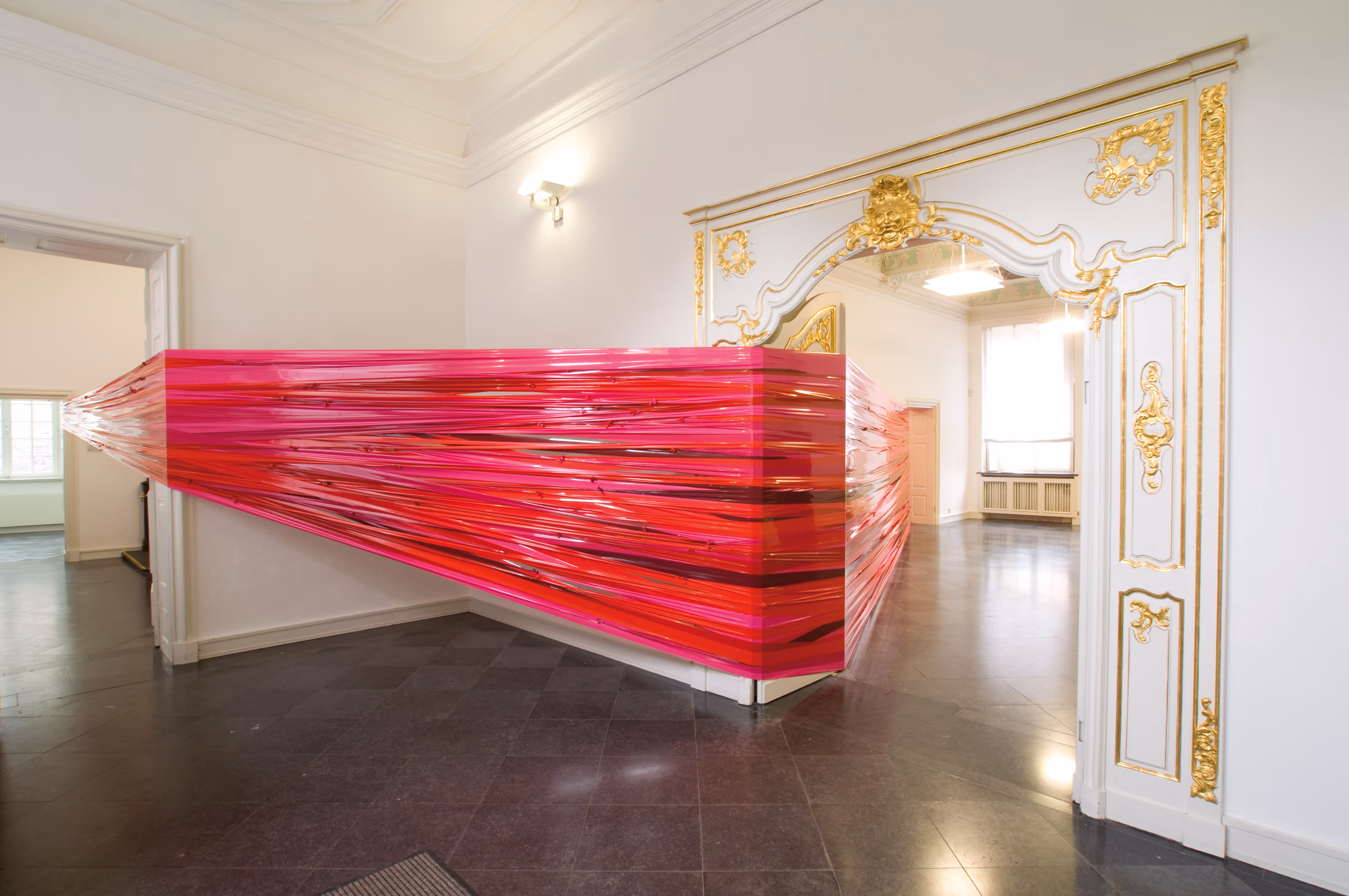 Rote Lackfolienstreifen in sechs verschiedenen Rottönen ziehen sich durch die gesamte Ausstellungsfläche. Ein neues Raumgefühl entsteht, da Räume sowohl durchschnitten als auch abgetrennt werden.