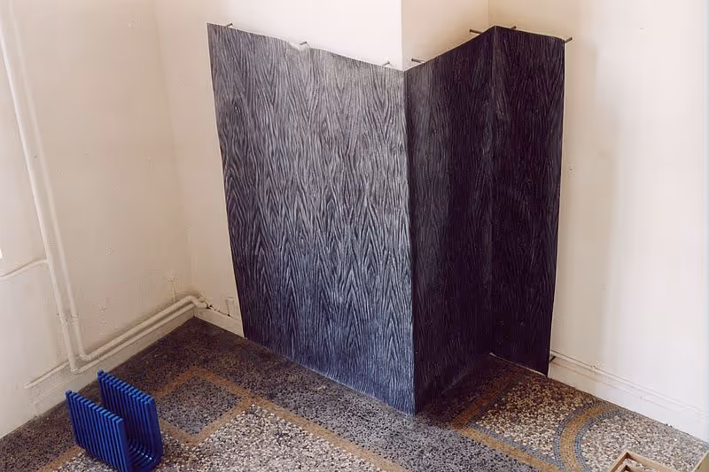 Zeichnung: Graphit auf Papier, 240cm x 300cm, 15cm Abstand zur WandObjekte: MDF blau lackiert, MDF, rot gefärbtes GummiRundgang Kunstakademie Düsseldorf