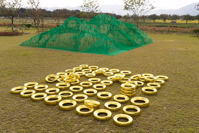 64 in Goldfolie eingewickelte Autoreifen greifen die Grundstruktur des Tempels auf, der auf ehemals 64 Säulen ruhte. geum verweist auf die Historie der ehemals goldene Hauptstadt Koreas mit einem Augenzwinkern. Die Besucher sind eingeladen die Reifen wie Spielsteine zu bewegen. Auf der Wiese entsteht SANSOO, eine Struktur aus Holzlatten mit einem schillernden durchlässigen Kleid aus grünem Netzgewebe. Die Grundfläche umschreibt ein Quadrat von 11,095m x 11,095m. Dies ist ein Viertel des historischen Tempels Hwangnyongsaji mit 2219cm x 2219cm, der ca. 100m weiter seinen Standort hatte, und das bedeutenste Denkmal von Gyeongju ist. Die von den Holzlatten getragene dreidimensionale Form verbindet sich mit der dahinterliegenden Bergsilhouette. SANSOO umschreibt eine eigene künstlich hergestellte Landschaft, die viele Assoziationen zulässt. Gerade in Gyeongju mit seinen vielen künstlichen historischen Grabhügeln, die zwischen den Häusern herausragen und den vielen archäologischen Ausgrabungen gibt es eine Verbindung zwischen der künstlerischen Arbeit SANSOO und seiner Umgebung. Der Titel SANSOO hat im koreanischen eine doppelte Bedeutung, zum einen kann man es mit Sonne und Wasser, sozusagen einer Ideallandschaft übersetzen werden, zum anderen entspricht es auch einer exakten mathematischen Form.