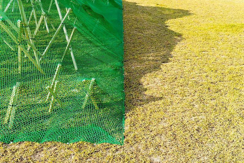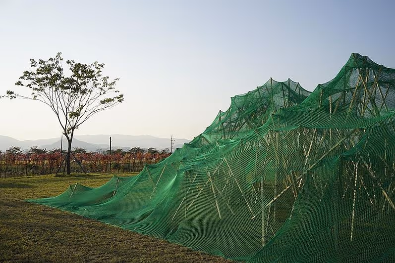 SANSOO is created on the meadow. The structure is made of wooden slats with a shiny dress made of green netting. The footprint is a square of 11.095m x 11.095m. This is a quarter of the historic Hwangnyongsaji Temple measuring 2219cm x 2219cm, located about 100m away, and is the most significant monument of Gyeongju. The three-dimensional shape carried by the wooden slats connects to the silhoueted mountain behind. SANSOO illustrates its own man-made landscape, which allows many associations. Gyeongju is especially known for its many artificial historic ancient burial mounds sticking out between houses and the many archaeological excavations. There is a connection between the artistic work SANSOO and its surroundings. The title SANSOO has a double meaning in Korean. On one hand it can be translated as sun and water that speaks of an ideal landscape while corresponding to an exact mathematical form.